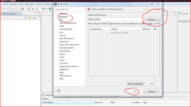 Öyle olsun.. Dediği gibi window->preferences menusunden Android SDK ‘yı set edelim…